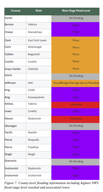 In some areas, rainfall totals reportedly reached about a month’s worth of precipitation in just a few days. Several of Washington’s largest rivers approached or reached record levels, and dozens of additional rivers experienced flooding.